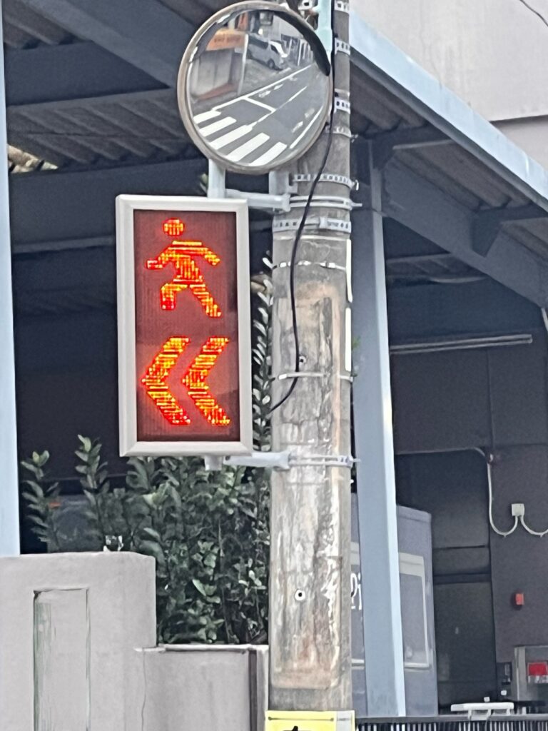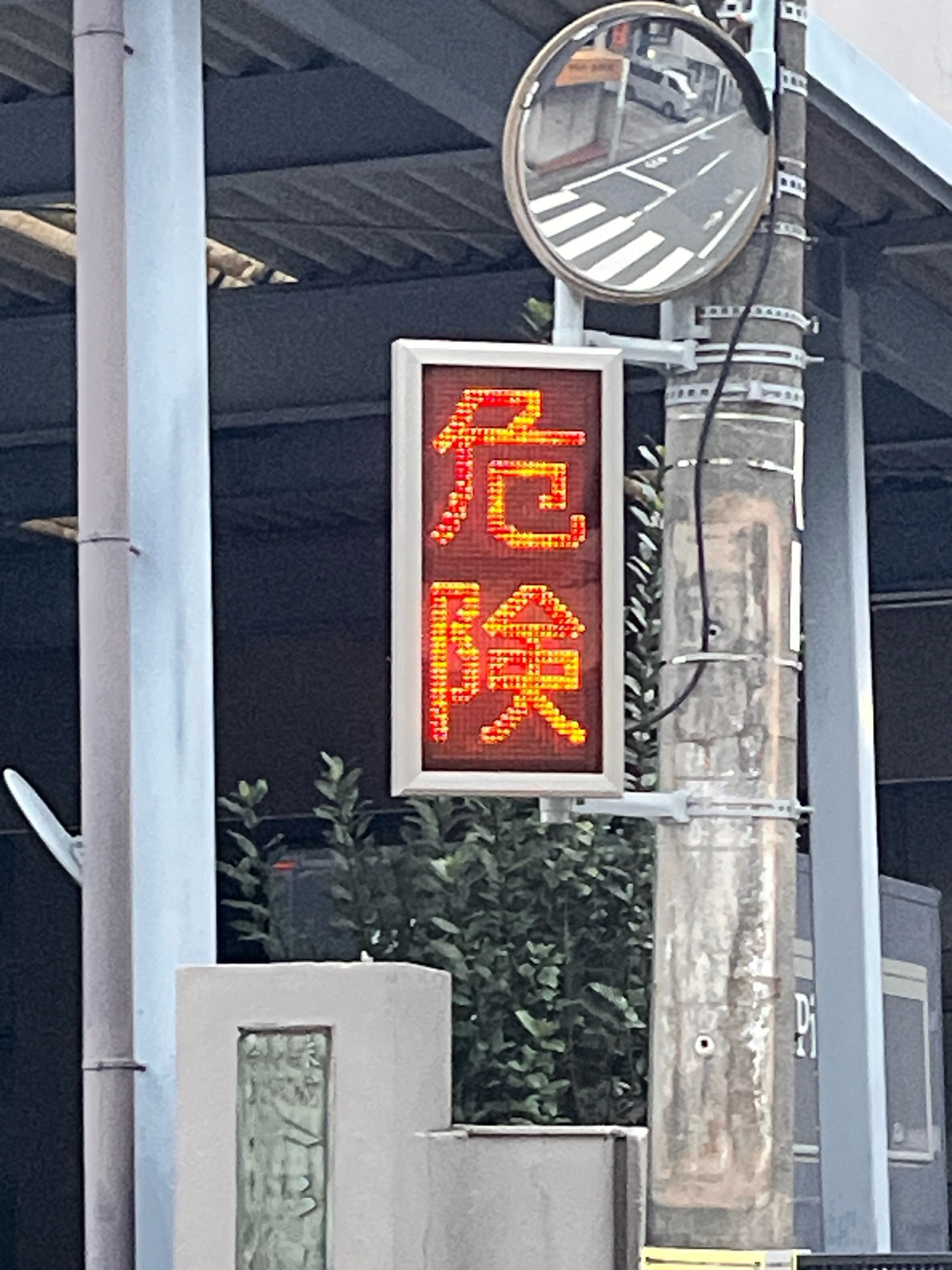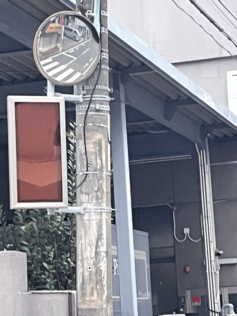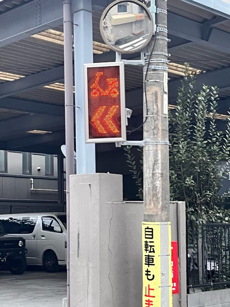 • 見通しの悪い交差点に、AIカメラ+電光掲示板が設置されていた