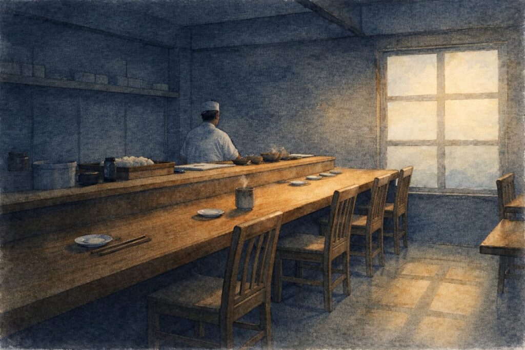 開店してしばらく、何も起きない。カウンターを拭く。包丁の位置を確かめる。シャリの温度を指先で感じ直す。やることは全部やったのに、手だけが落ち着かない。